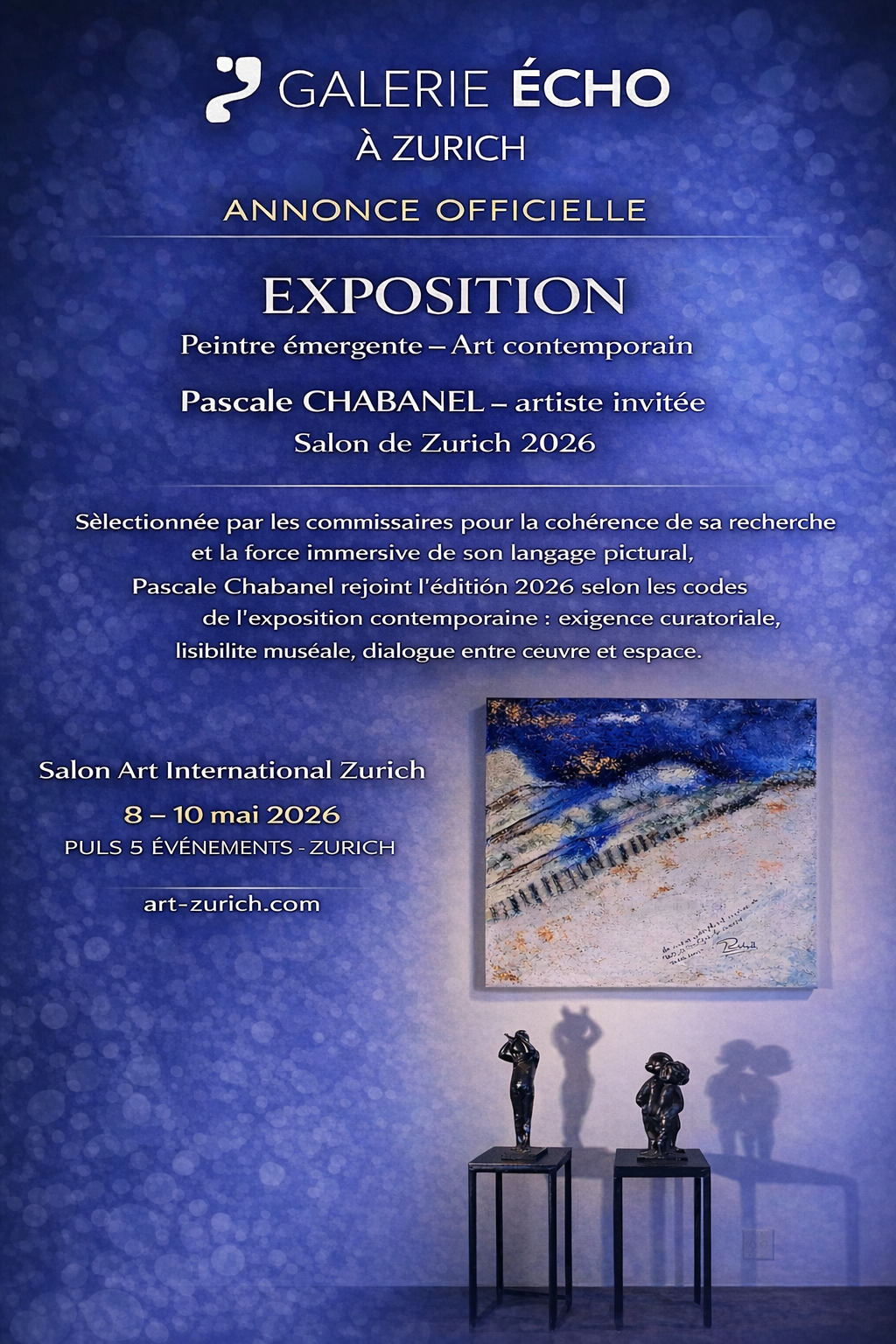 Sélectionnée par les commissaires pour la cohérence de sa recherche et la force immersive de son langage pictural, Pascale Chabanel rejoint l’édition 2026 du Salon Art International Zurich selon les codes de l’exposition contemporaine : exigence curatoriale, lisibilité muséale, dialogue précis entre l’œuvre et l’espace.